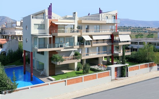 Complex of 10 luxury apartments on a corner plot of 1560sq.m., overlooking the old airport and the sea. The building mass has views not only on the two streets that surround the plot but also on an interior patio with a big garden and a pool.